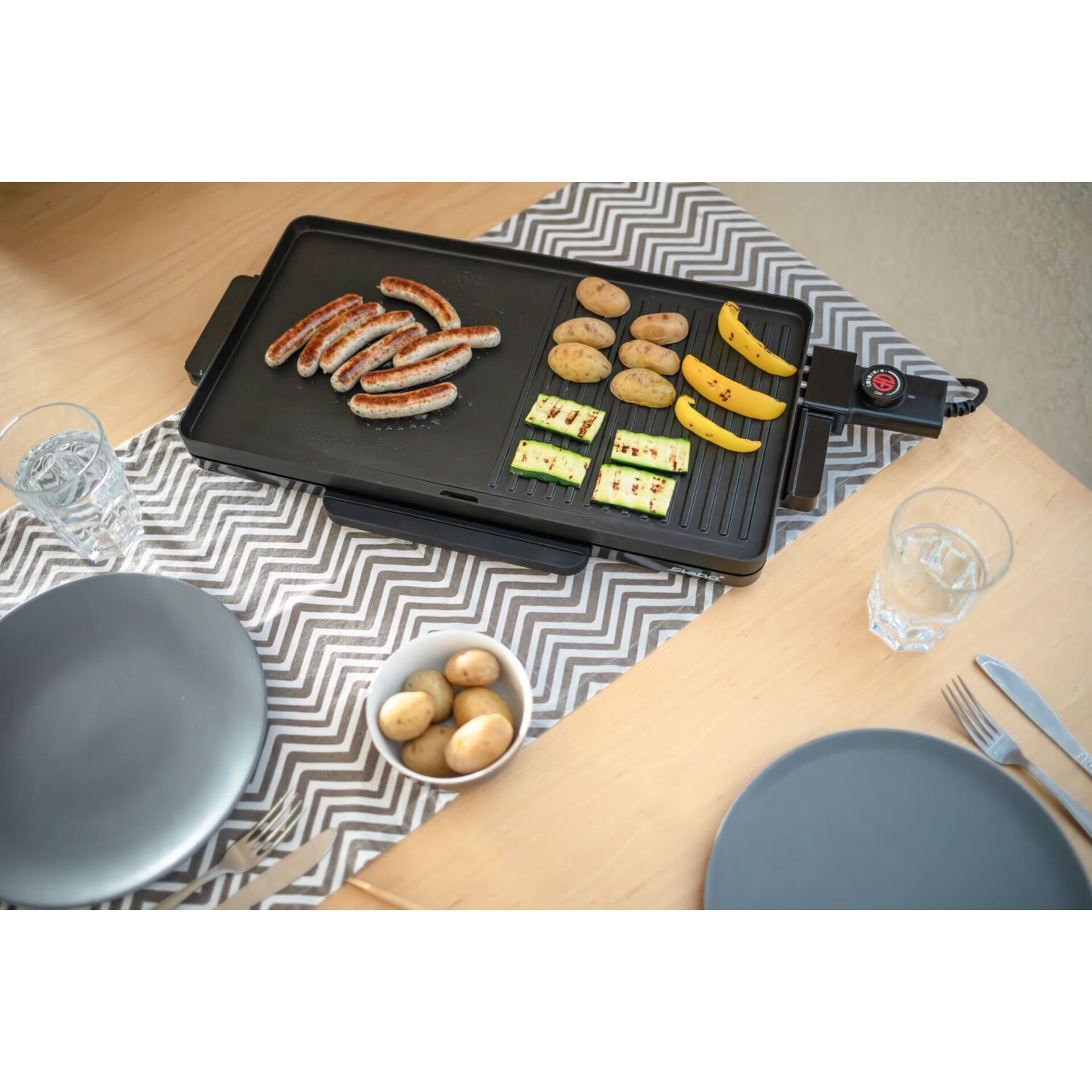 - Alu-Druckguß-Grillplatte mit Grillmuster für Steaks oder Fisch und glattem Bereich für Würste, Meeresfrüchte etc.
