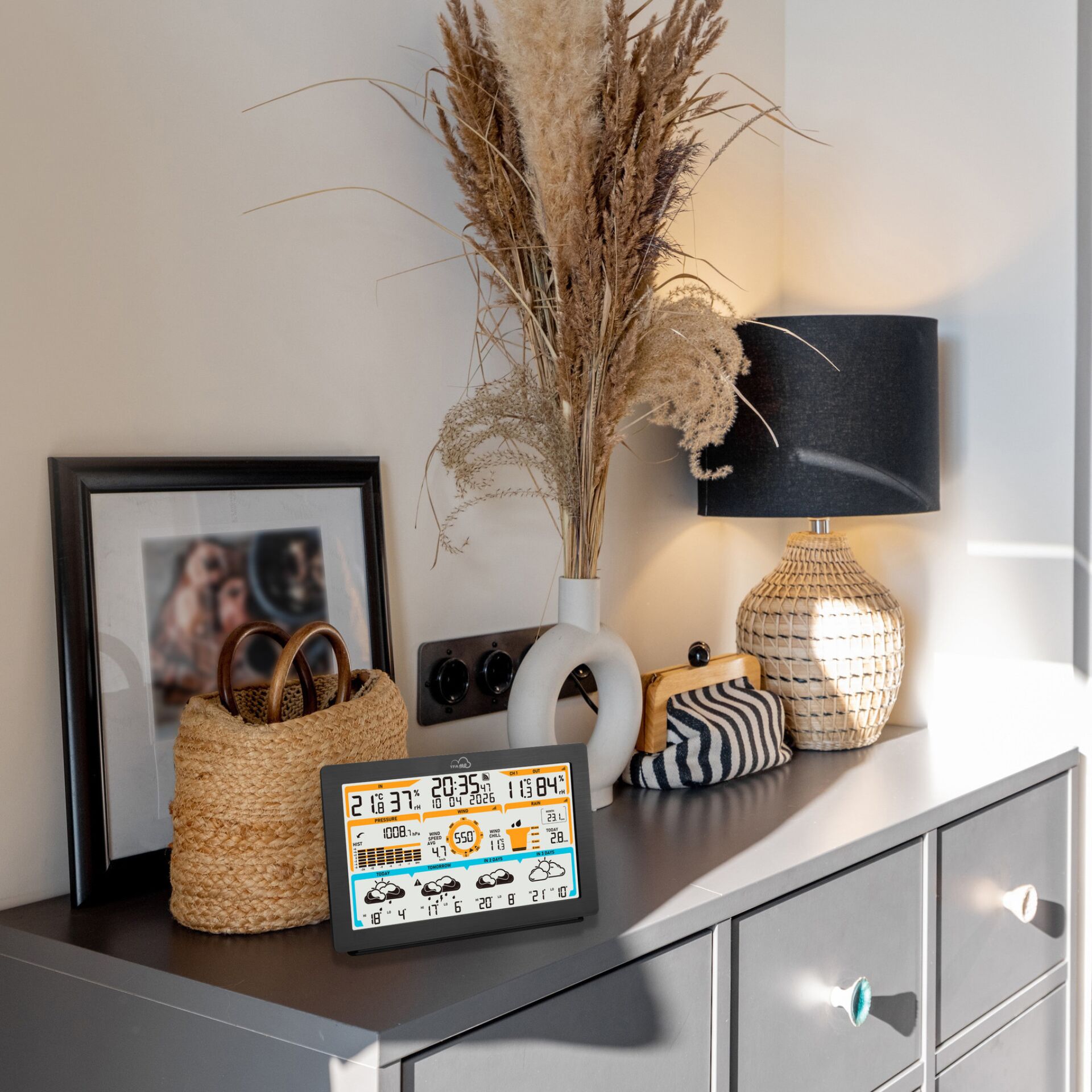 - Kabellose Übertragung und Anzeige der Außentemperatur und Luftfeuchtigkeit, Regenmenge, Windgeschwindigkeit und -richtung