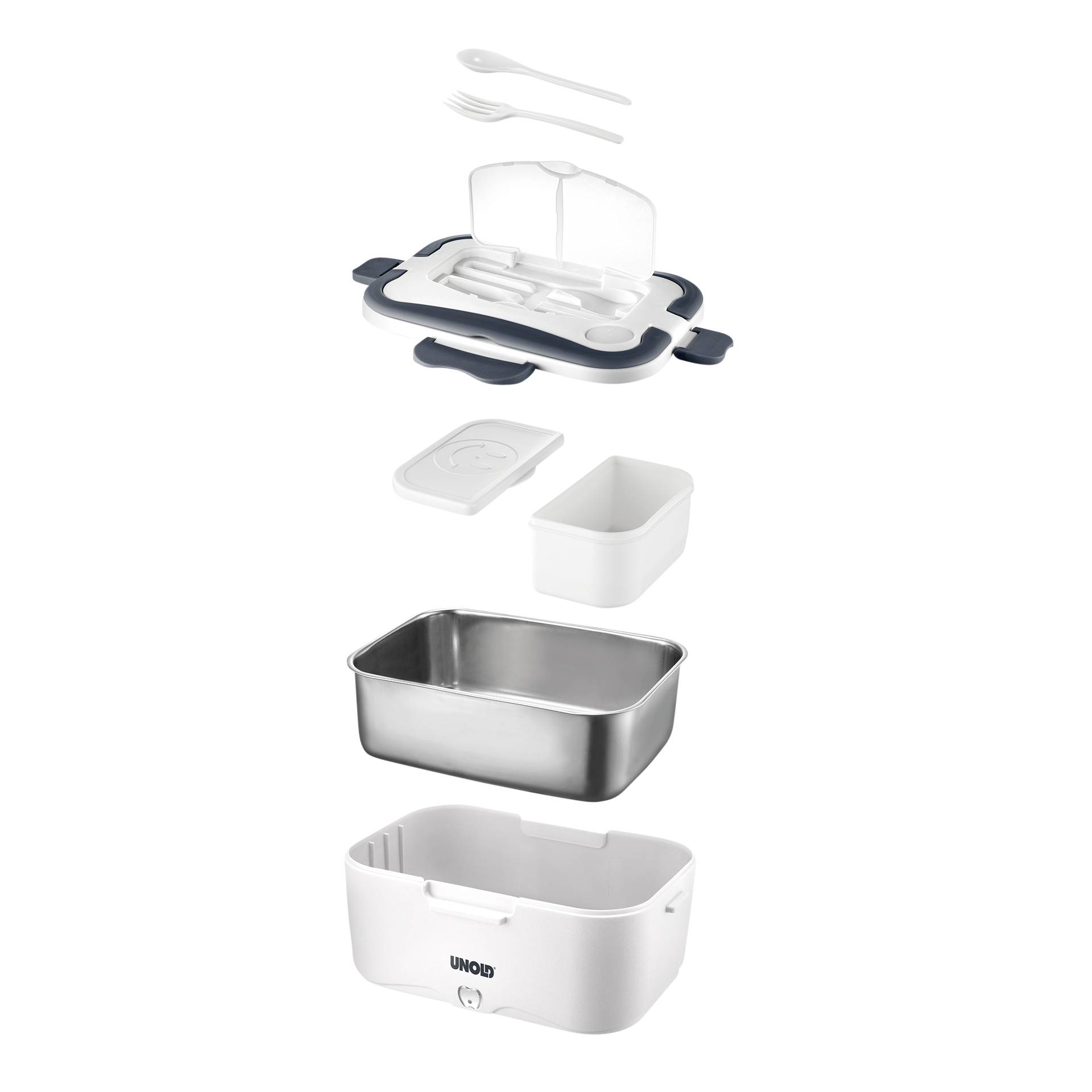 Leckereien rein, Strom an und fertig ist das Mittagessen! Für alle, die keine Mikrowelle im Büro haben oder viel unterwegs sind, ist die elektrische UNOLD® Lunchbox eine hervorragende Lösung. Löffel und Gabel im Deckel und die herausnehmbare Dose mit Deckel für Beilagen oder Nachtisch machen die Lunchbox zum kleinen Genuss-Wunder. In der UNOLD® Lunchbox mit einem Volumen von ca. 1,5 Liter lassen sich Speisen bis maximal ca. 70 °C erwärmen. Lunchboxdeckel, Besteck, Dose mit Deckel und der herausnehmbare Edelstahlbehälter sind spülmaschinengeeignet.