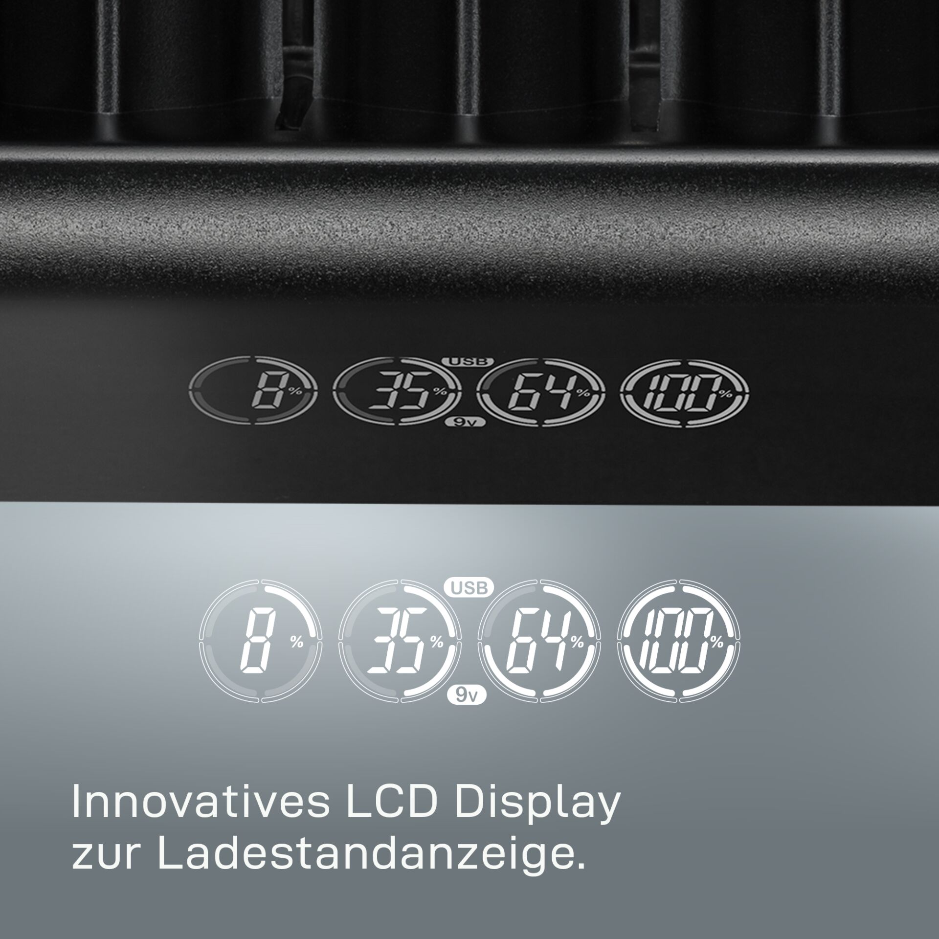 Der LCD Universal Charger+ vereint einfache Handhabung mit leistungsstarken Funktionen. Er ist mit einem benutzeroptimierten LCD-Display ausgestattet und bietet fortschrittliche Funktionen wie kurze Ladezeiten sowie Reaktivierungs- und Single-Slot-Lademodi. Das moderne, innovative VARTA-Design in Kombination mit zahlreichen Sicherheitsfunktionen macht ihn zur idealen Wahl für Vielnutzer und fortgeschrittene Anwender.