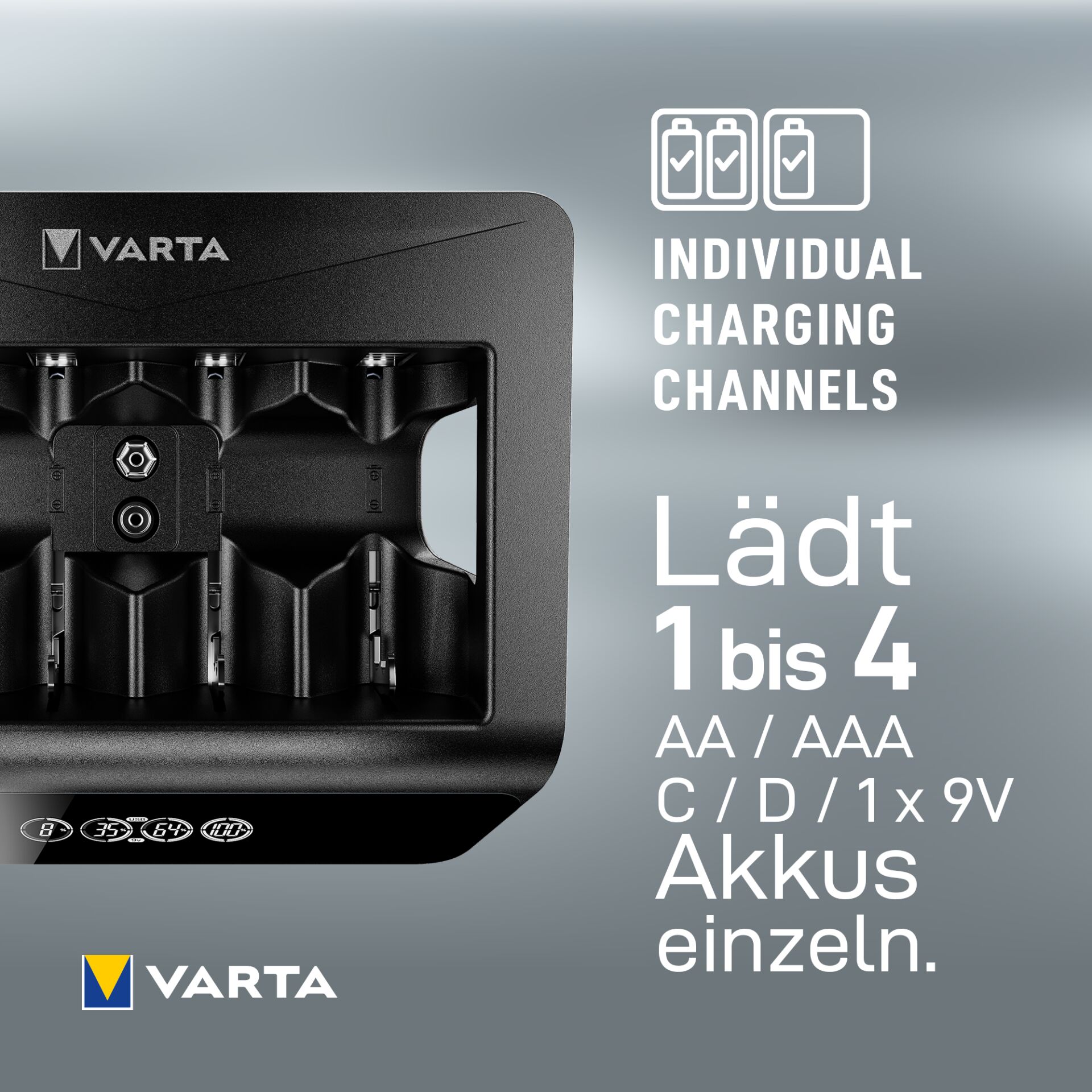 - Lädt bis zu 4 AA, AAA, C, D oder 1x 9V