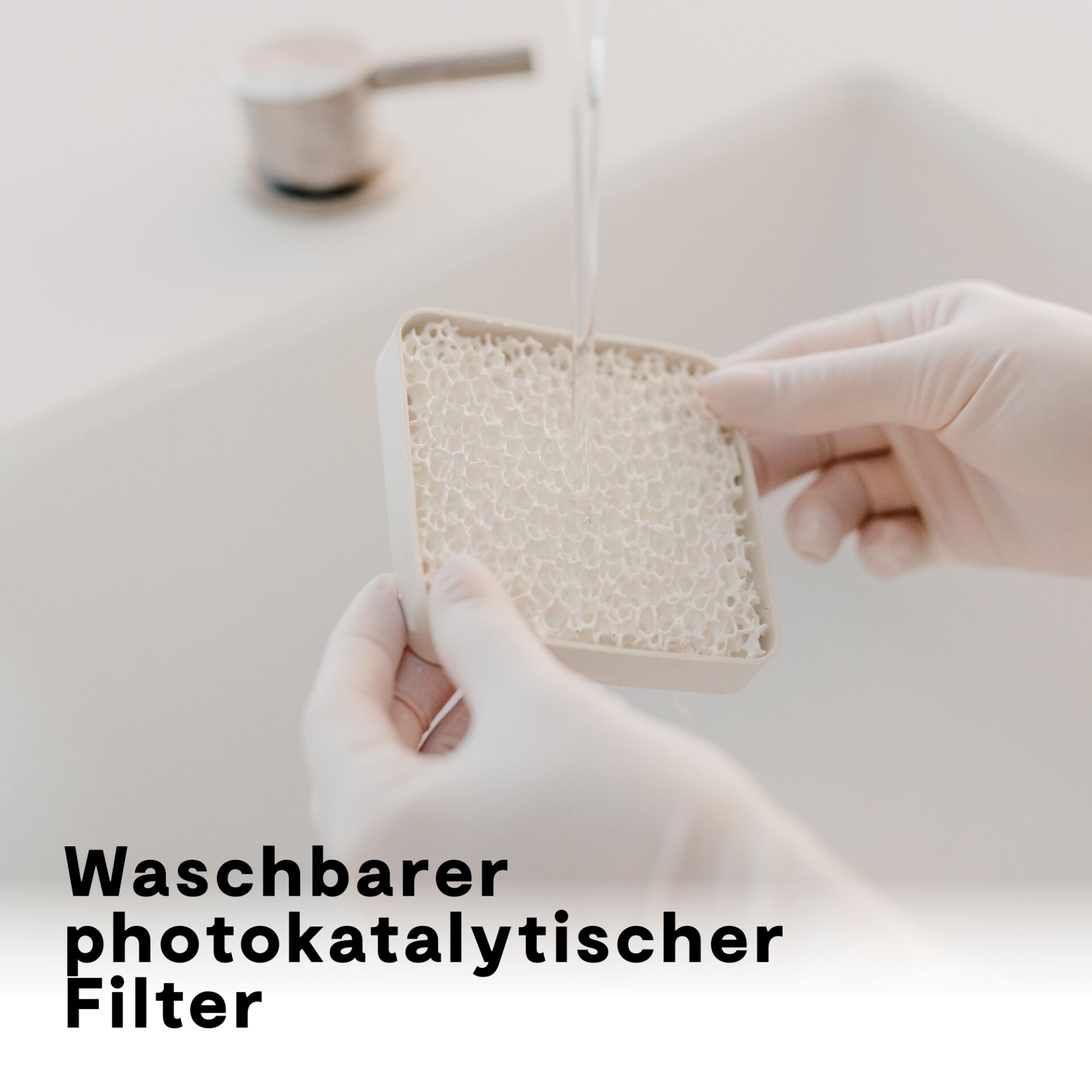 Wasche den Filter von Shelfy unter fließendem Wasser. Dank seiner photokatalytischen Technologie werden Gerüche und Bakterien neutralisiert und du musst keine Filter mehr wechseln.