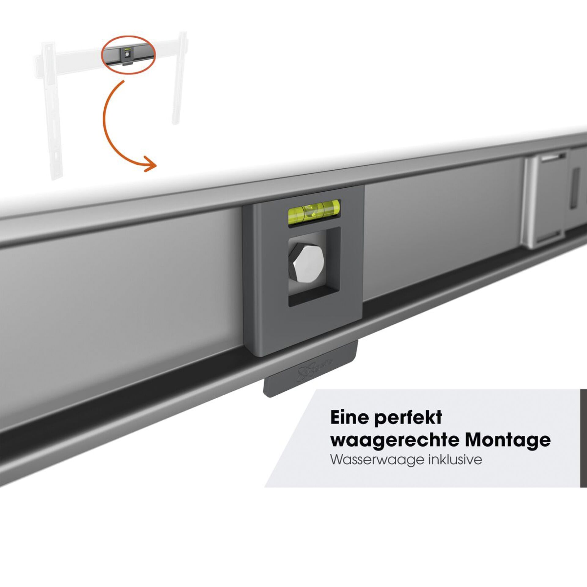 Die ELITE Fixed TV-Wandhalterung bietet smarte Extras wie eine eingebaute Wasserwaage, um Ihren Fernseher perfekt gerade zu montieren, und integrierte Kabelclips, um Ihre Kabel ordentlich hinter Ihrem Fernseher zu verstecken.