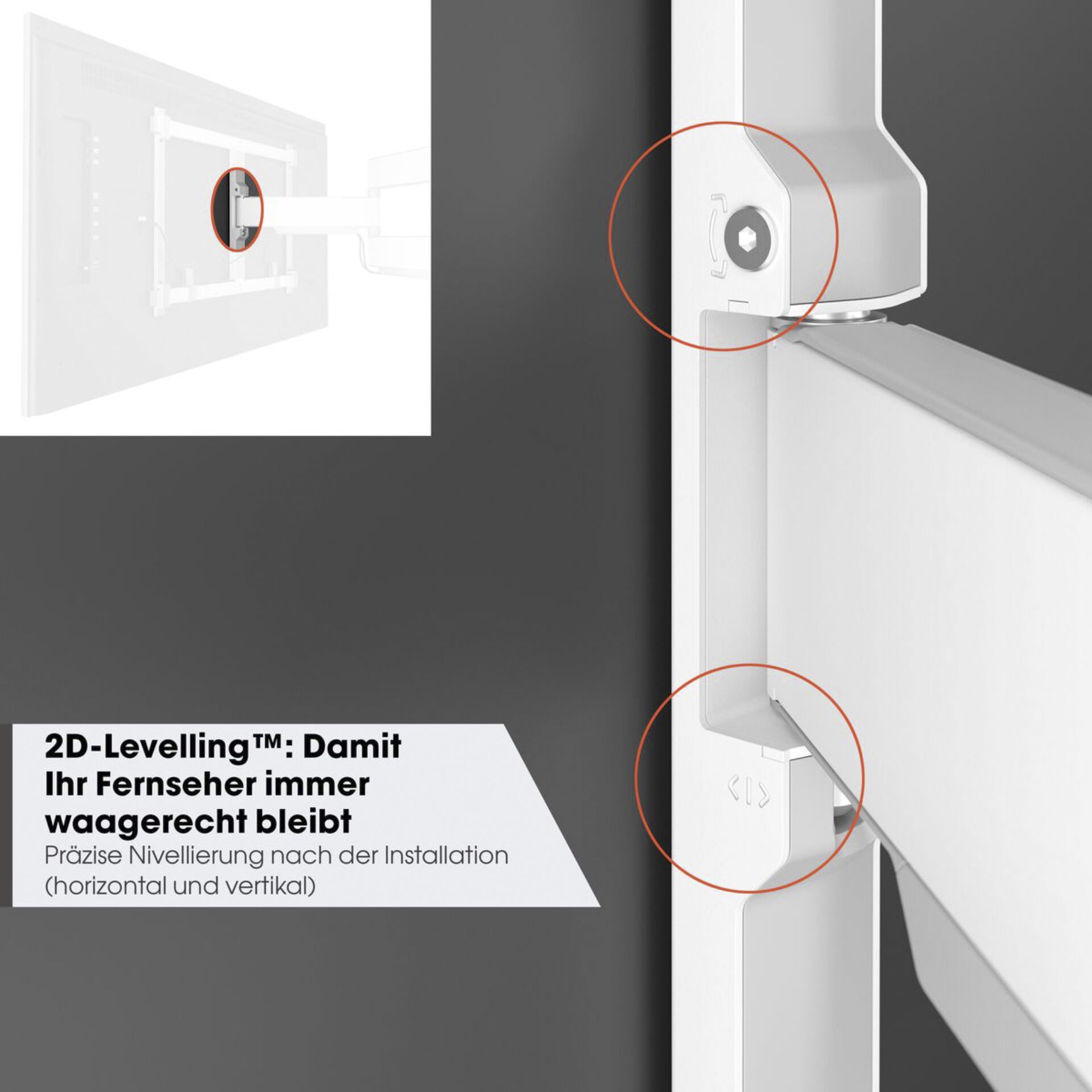 ELITE Full-Motion+ TV-Wandhalterungen zeichnen sich durch ihre Perfektion aus. Die TV-Wandhalterung verfügt über 2D Leveling, sodass Sie Ihren Fernseher auch nach der Installation sowohl horizontal als auch vertikal perfekt ausrichten können. Dank des einzigartigen Cable Inlay System (CIS) verlaufen die Kabel unsichtbar in den Tragarmen. Mit den speziellen Kabelhalterungen können Sie die Kabel auf der Rückseite Ihres Fernsehers ordentlich verstauen. Alle technischen Details der TV-Wandhalterung sind schön hinter eleganten Abdeckplatten versteckt.