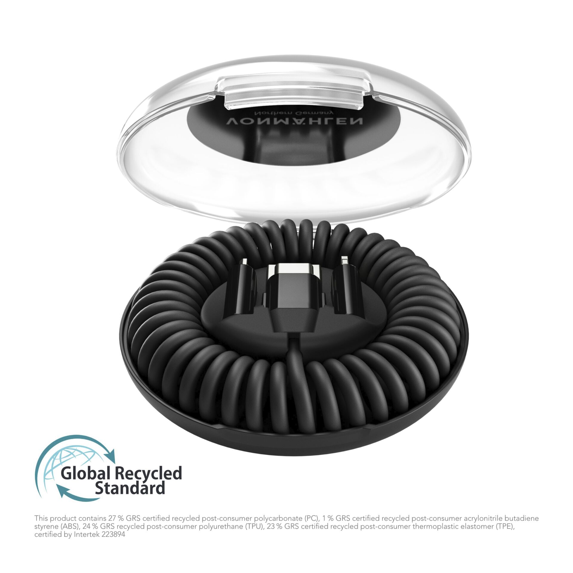 Der nachhaltige Begleiter für unterwegs: Der allroundo eco von Vonmählen ist ein kompaktes, spiralförmiges All-in-One Lade- und Datenkabel. Das aus recycelten Materialien bestehende spiralförmige Kabel ist bis zu 90 Zentimeter lang und ermöglicht so eine flexiblere Nutzung des Telefons während des Ladevorgangs. Gleichzeitig verhindert die Spiralform ein Verheddern des Kabels, da sich das Kabel bei Nichtgebrauch zusammenzieht und sich in dem dazugehörigen Case verstauen lässt.