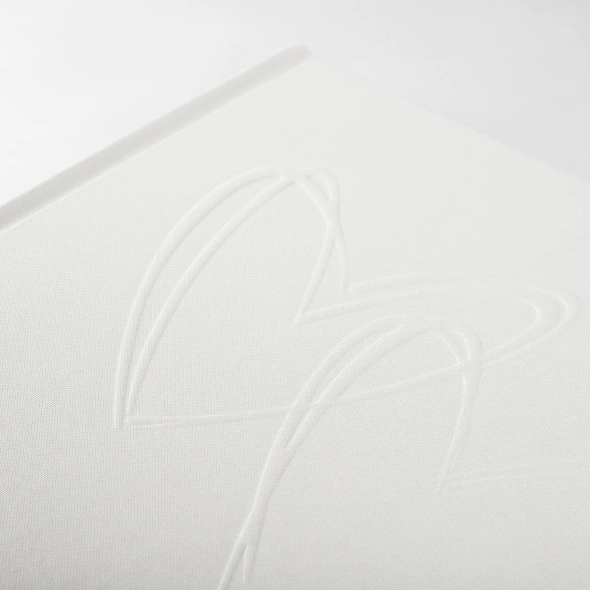 Buchgebundenes Fotoalbum mit Leineneinband und mit einer Blindprägung in Herzform veredelt. Das Album im Format 20x20 cm hat 40 weisse Seiten aus säurefreiem Fotokarton. Ohne Pergamin.