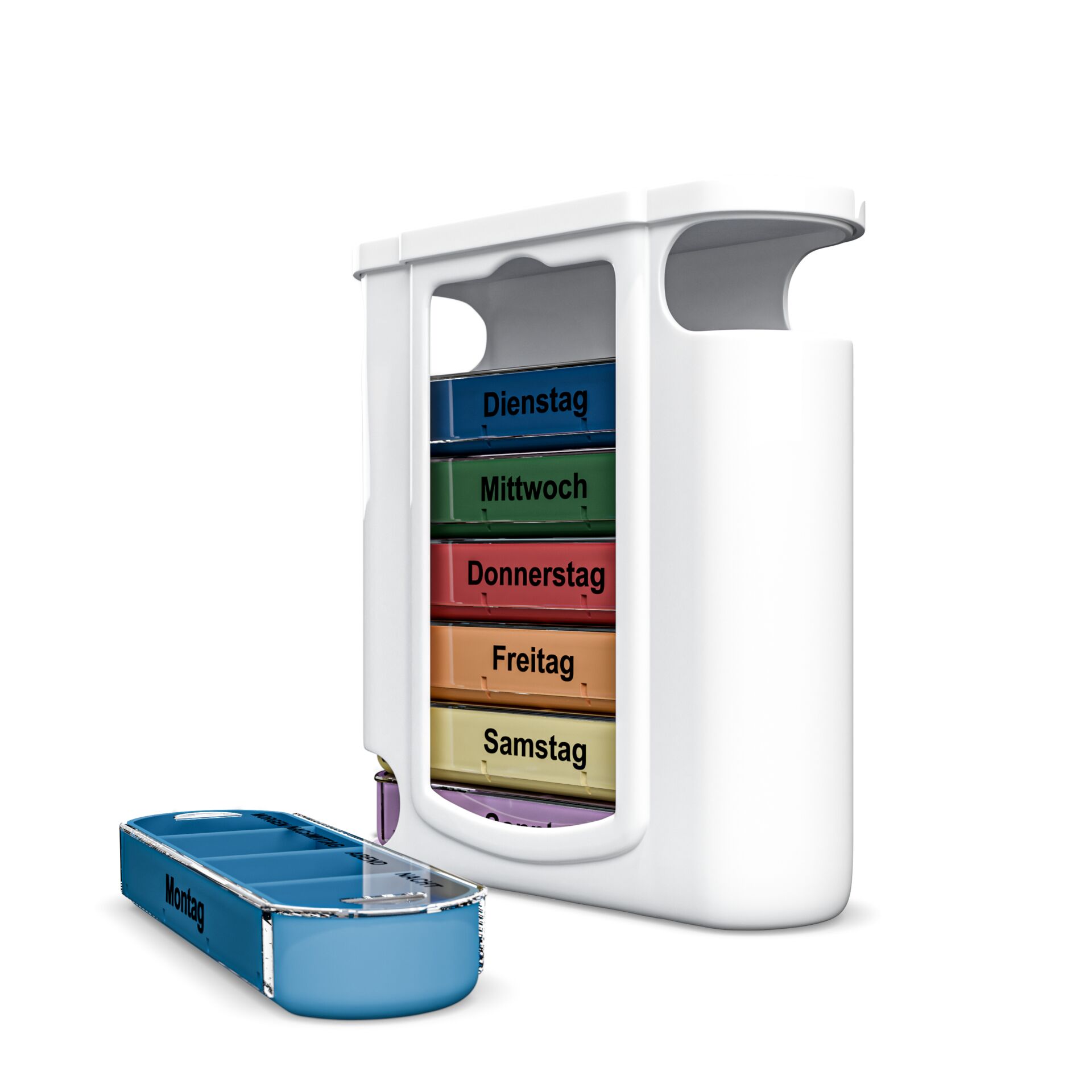 - 7 einzeln herausziehbare Tagesdosen (Montag bis Sonntag)