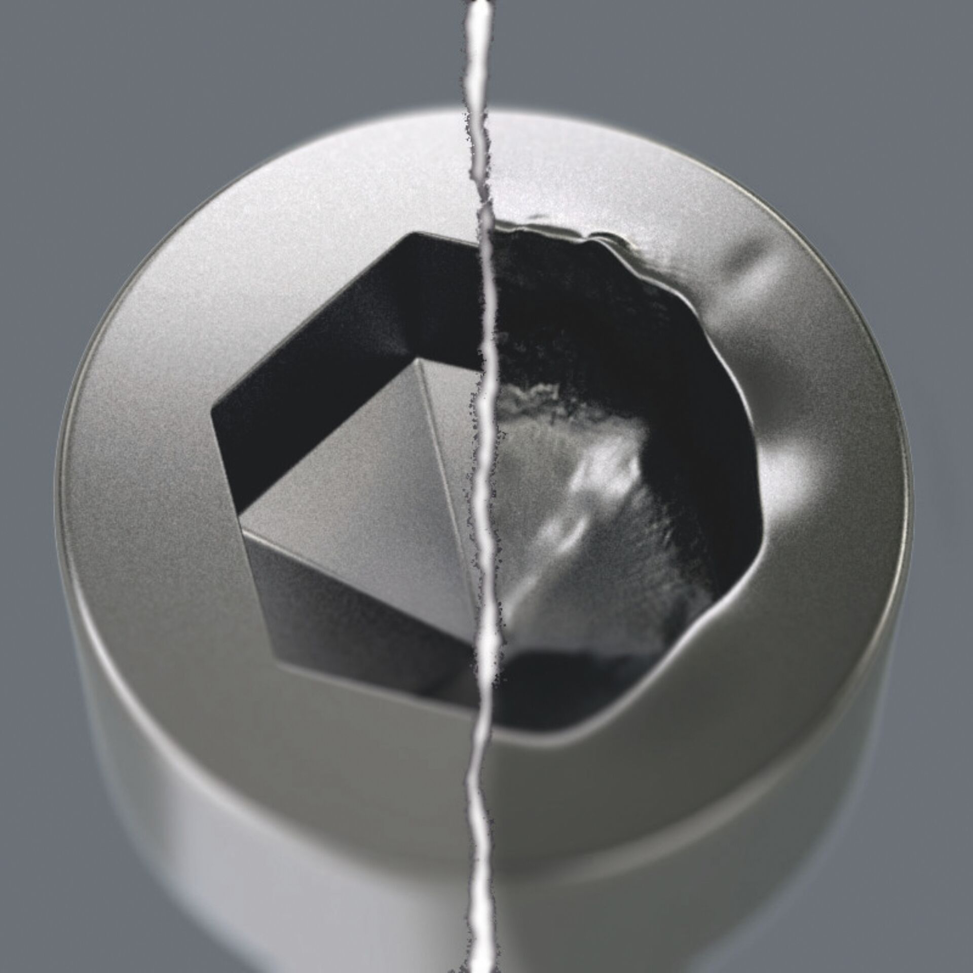 Das Hex-Plus-Profil bietet größere Anlageflächen im Schraubenkopf. Die Kerbwirkung wird dadurch auf ein Minimum reduziert, die Zerstörung des Schraubenkopfes nahezu eliminiert. Mit Sechskantkugelkopf am langen Schenkel: Durch die kugelförmigen Abtriebsprofile ist ein Auslenken oder Schwenken der Werkzeugachse zur Schraubenachse möglich, so dass dadurch "um die Ecke" geschraubt werden kann.
