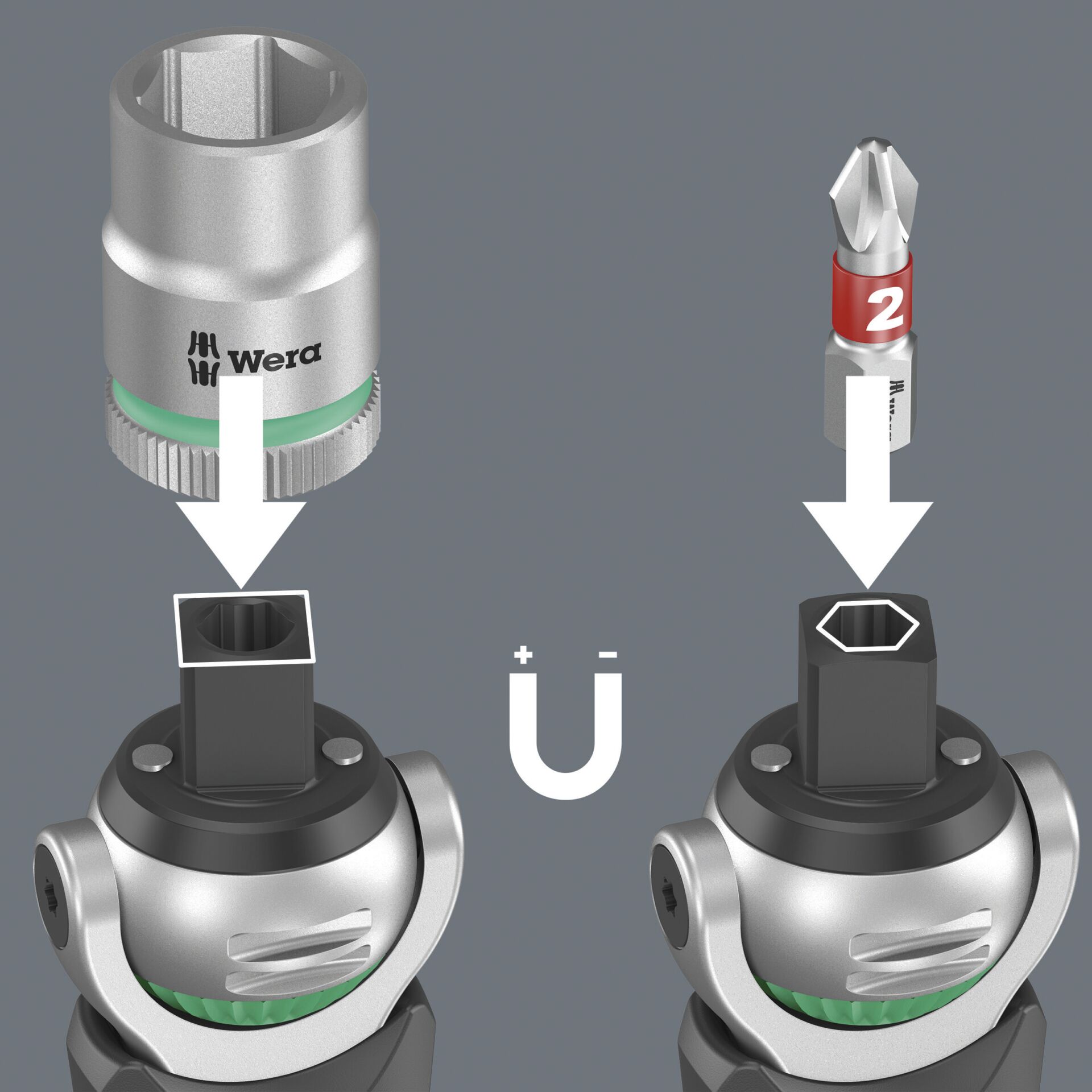 - Die magnetische Direktaufnahme macht aus der 3/8"-Knarre gleichzeitig einen Bit-Ratschenschraubendreher mit 1/4"-Bitaufnahme