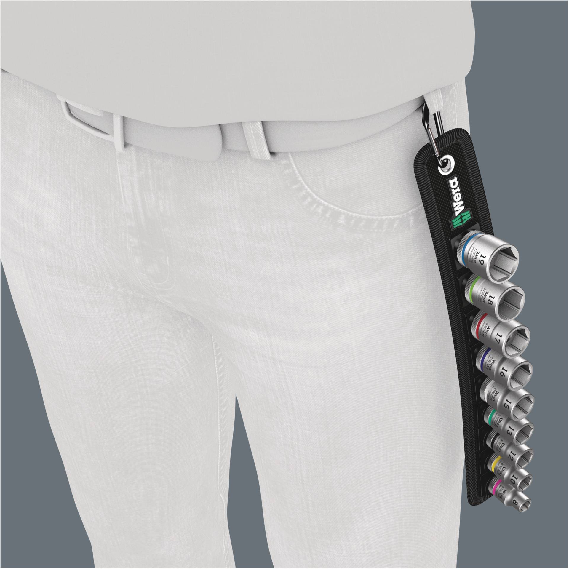 Robuster Textilgurt (Belt) im typischen Wera Design mit 9 Nüssen auf engstem Raum. Ein leichtgängiger Drehmechanismus sorgt für einen sicheren Halt und leichte Entnahme der Nüsse. Mit "Take it easy" Werkzeugfinder mit Farbkennzeichnung nach Größen - zum einfachen und schnellen Finden des benötigten Werkzeugs. Inklusive Karabinerhaken zur Befestigung an Gürtelschlaufen oder Taschen. Mit Vliesrücken und Klettklebestreifen zur einfachen Befestigung z.B. an Wand, Regal, Werkstattwagen und Wera 2go Werkzeugtransportsystem.