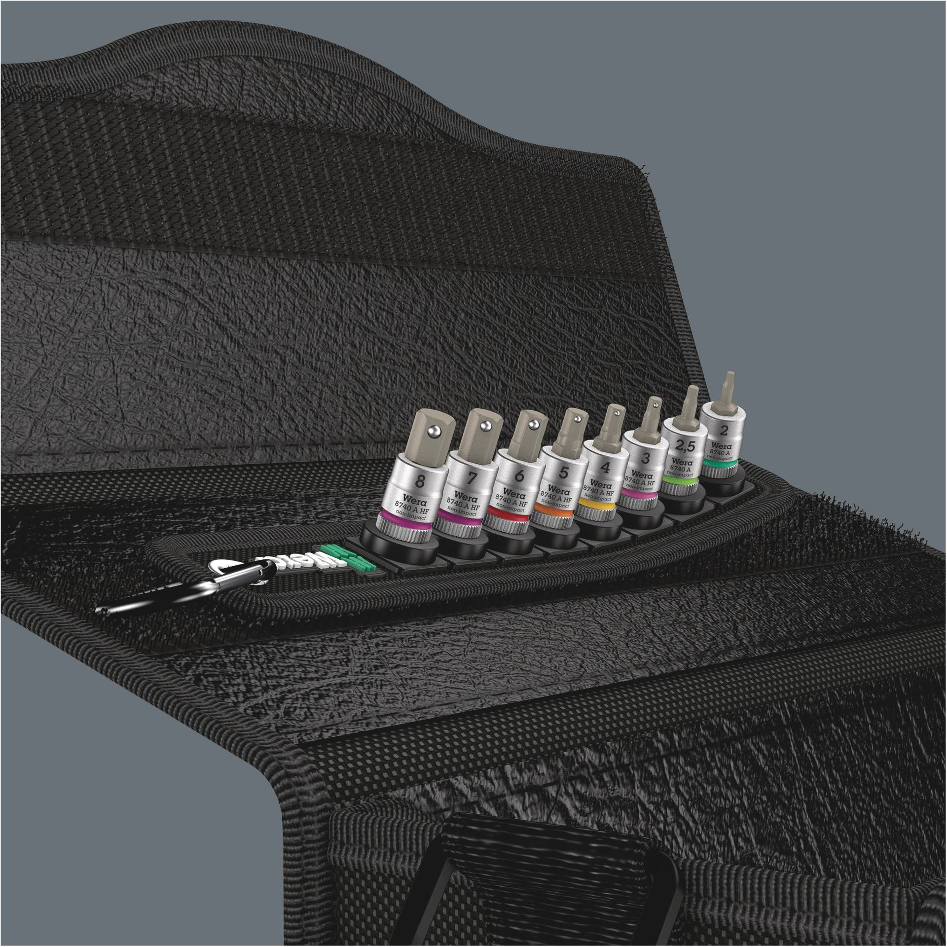 Robuster Textilgurt (Belt) im typischen Wera Design mit 8 Bitnüssen auf engstem Raum. Ein leichtgängiger Drehmechanismus sorgt für einen sicheren Halt und leichte Entnahme der Nüsse. Mit "Take it easy" Werkzeugfinder mit Farbkennzeichnung nach Größen - zum einfachen und schnellen Finden des benötigten Werkzeugs. Inklusive Karabinerhaken zur Befestigung an Gürtelschlaufen oder Taschen. Besonders kurze, stabile Bit-Nüsse mit den Vorzügen der Wera Bit-Technologie. Bitnüsse mit Haltefunktion für besonders komfortables Schrauben und reduzierter Gefahr des Schraubenverlustes beim Zuführen zum Werkstück. Mit Vliesrücken und Klettklebestreifen zur einfachen Befestigung z.B. an Wand, Regal, Werkstattwagen und Wera 2go Werkzeugtransportsystem.