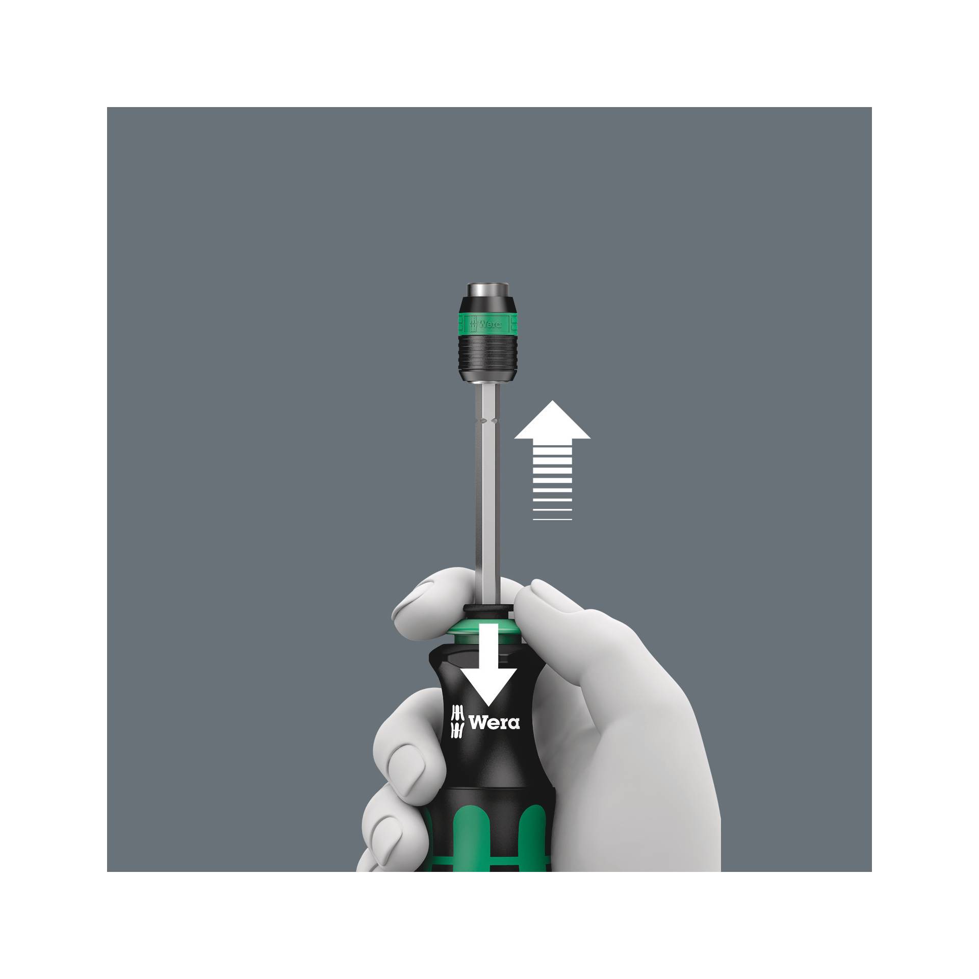 Die Wera Kompaktwerkzeuge ermöglichen den gleichzeitigen Einsatz der beiden Verschraubungsarten "Hand" oder "Maschine". Das Griff -Wechselklingensystem in kompakter Bauweise mit verschiedenen Klingenspitzen auf kleinstem Raum macht den Anwender mobil und flexibel. Mit Verbindungsteil, Bajonett, Rapidaptor-Technologie. Kraftform-Griff mit Abrollschutz, mehrkomponentig für besonders ergonomisches Verschrauben. Integriertes Magazin zur Aufbewahrung der Bits. Die im Griff versenkbare Bajonettklinge mit Schnellwechselfutter erlaubt die schnelle Handbetätigung auch in räumlich beengten Arbeitssituationen, wenn die Klinge eingefahren ist. Durch einfaches Betätigen der Arretierhülse kann die Klinge herausgefahren werden. Der Bajonetthalter ist nun wie ein vollwertiger Schraubendreher einsetzbar. Die Bajonettklinge kann entnommen und als Maschinenadapter eingesetzt, sowie in die Ausgangslage zurückgeführt werden. Mit praktischer Gürteltasche.