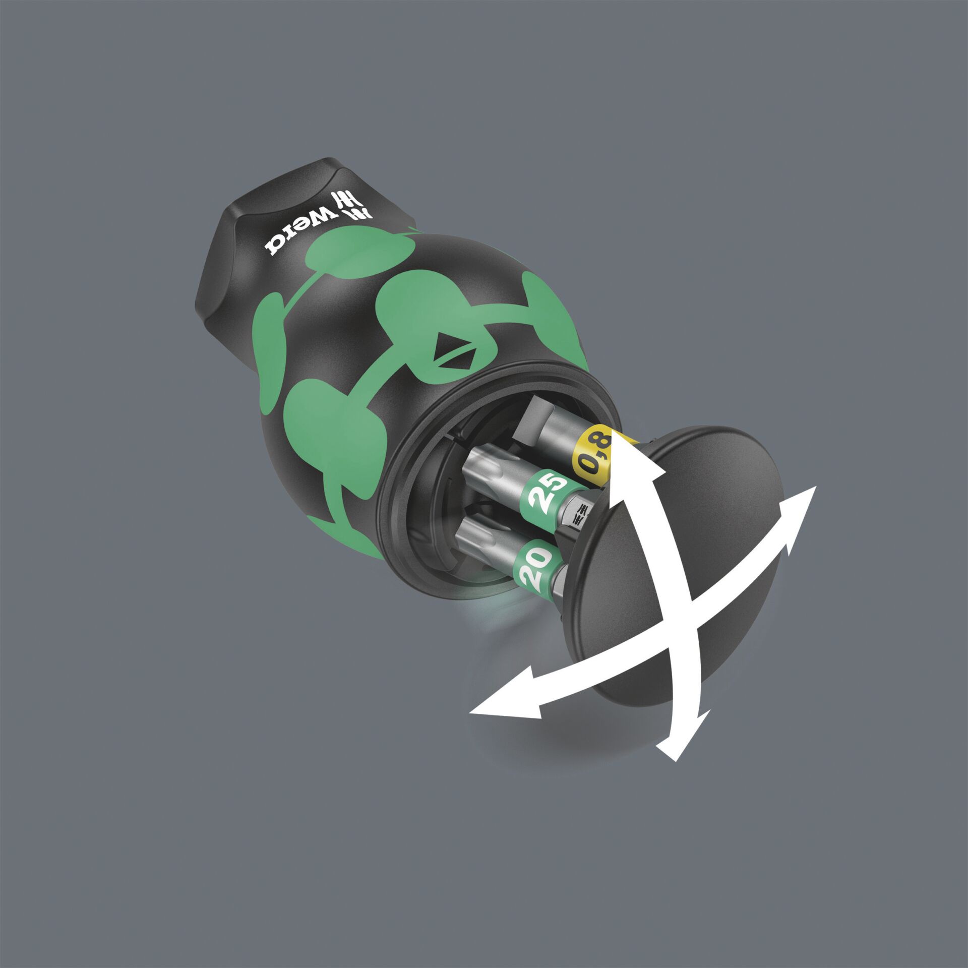 Das schwenkbare Bit-Magazin ermöglicht die leichte Entnahme der Bits in nahezu jeder Situation und ist unverlierbar. Die Bits sind sicher untergebracht.