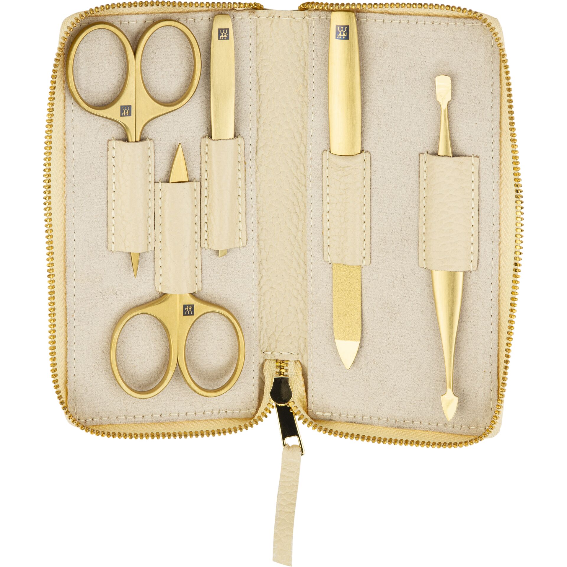 Mit diesem eleganten 5-teiligen Nagelpflege-Set bringst du deine Finger- und Fußnägel im Handumdrehen in Form. Die hochwertigen Pflegeinstrumente aus rostfreiem Edelstahl sind mit einer goldenen PVD-Beschichtung veredelt und bieten dir eine langlebige und hygienische Anwendung. Im beigen Echtleder-Etui mit Reißverschluss und weichem Samtfutter sind deine Tools sicher und stilvoll verstaut – ideal für zuhause oder unterwegs.